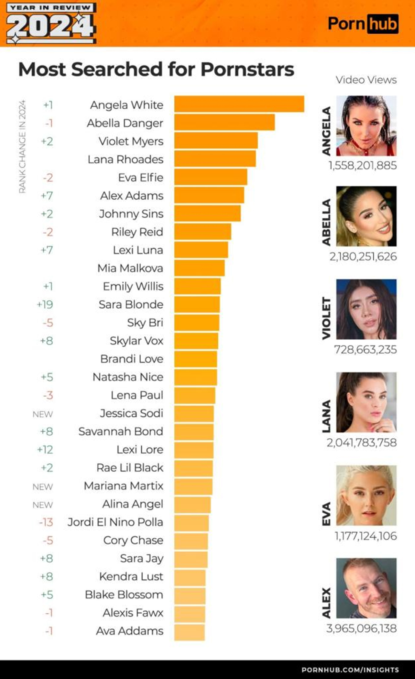 Η Angela White σκαρφάλωσε φέτος στην πρώτη θέση, ως η πορνοστάρ με τις περισσότερες αναζητήσεις για το 2024, με τις Abella Danger και Violet Myers να ακολουθούν από κοντά.