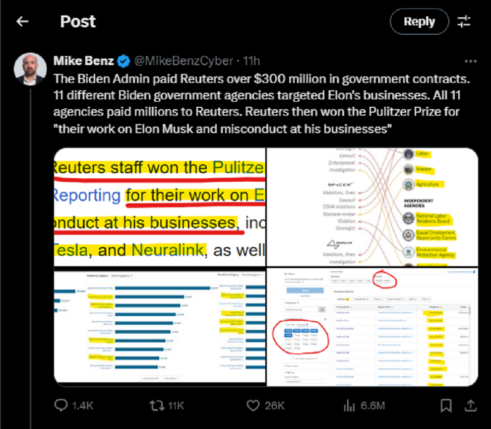Ο Μπεντς έγραψε ότι κατά την προεδρία του Τζο Μπάιντεν, το αμερικανικό Δημόσιο χορήγησε στην Thomson Reuters, την εταιρεία που κατέχει το πρακτορείο ειδήσεων, κυβερνητικά συμβόλαια ύψους άνω των 300 εκατομμυρίων δολαρίων.