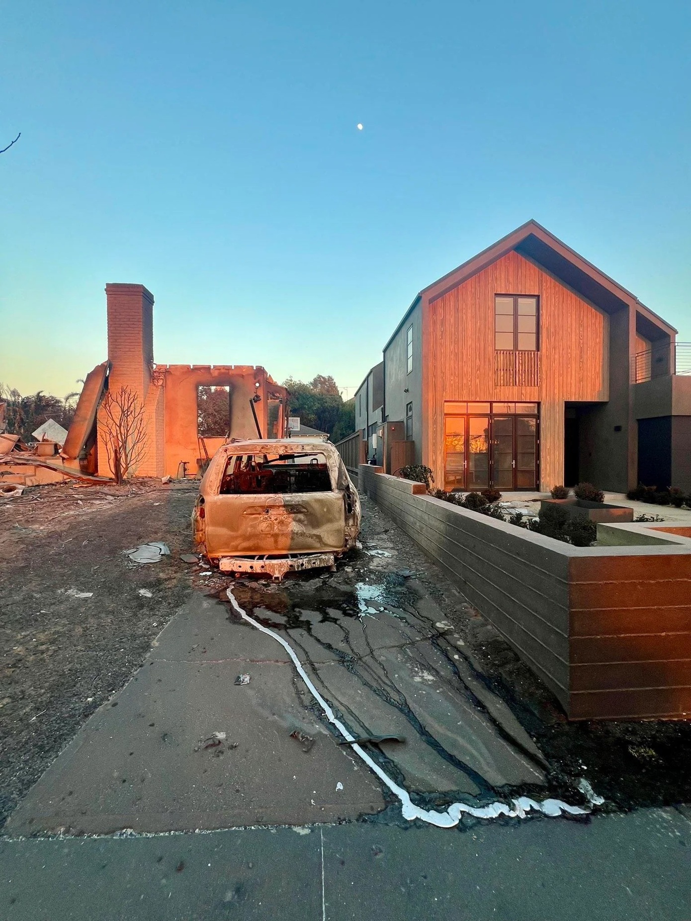 Ο αρχιτέκτονας ανέβασε φωτογραφίες από ένα σπίτι στην περιοχή του Πάλισεΐντς το οποίο σχεδίασε ο ίδιος, γράφοντας: «Πραγματικά, δεν υπάρχουν λόγια – απλώς μια παράσταση τρόμου. Μερικές από τις σχεδιαστικές επιλογές που κάναμε εδώ, βοήθησαν. Ήμασταν όμως και πολύ τυχεροί».