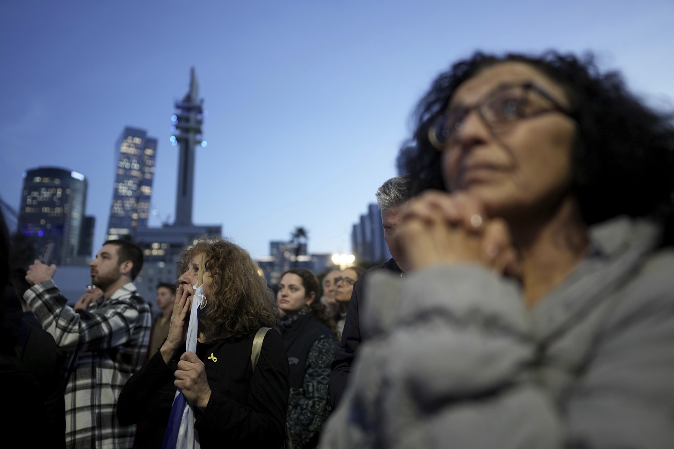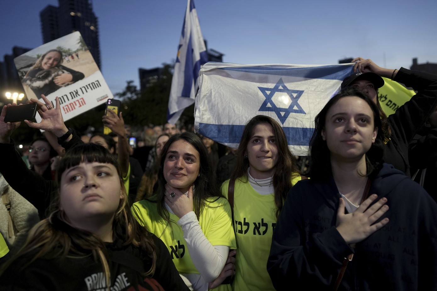 Συγγενείς και φίλοι ανθρώπων που απήχθησαν από τη Χαμάς και μεταφέρθηκαν στη Γάζα, συγκεντρώθηκαν στην πλατεία Ομήρων του Τελ Αβίβ για να παρακολουθήσουν τη διαδικασία απελευθέρωσης των τριών πρώτων ομήρων, στο πλαίσιο της συμφωνίας εκεχειρίας ανάμεσα σε Ισραήλ και Χαμάς.