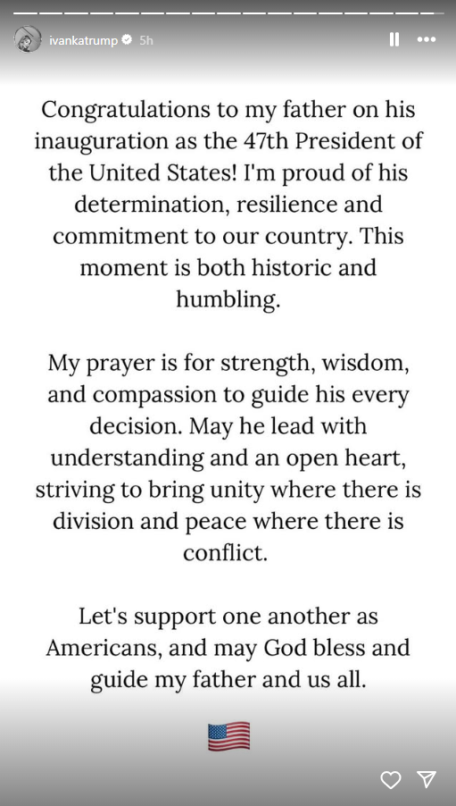 «Συγχαρητήρια στον πατέρα μου για την επιτυχία της ορκωμοσίας ως ο 47ος πρόεδρος των Ηνωμένων Πολιτειών. Είμαι περήφανη για την αποφασιστικότητα, την ανθεκτικότητα και τη δέσμευσή του στη χώρα μας. Αυτή η στιγμή είναι ταυτόχρονα ιστορική και ταπεινή» έγραψε χαρακτηριστικά.