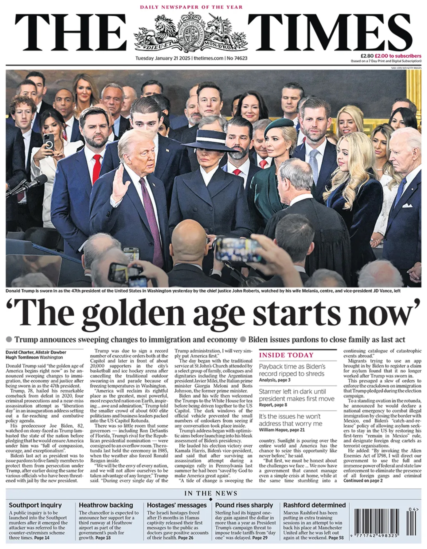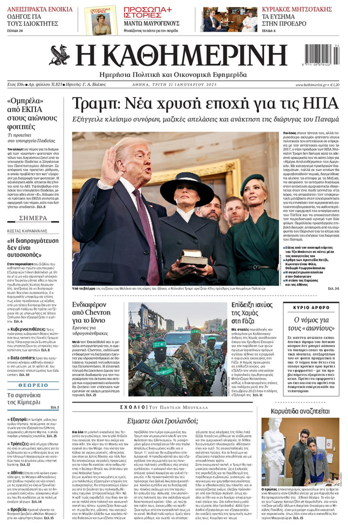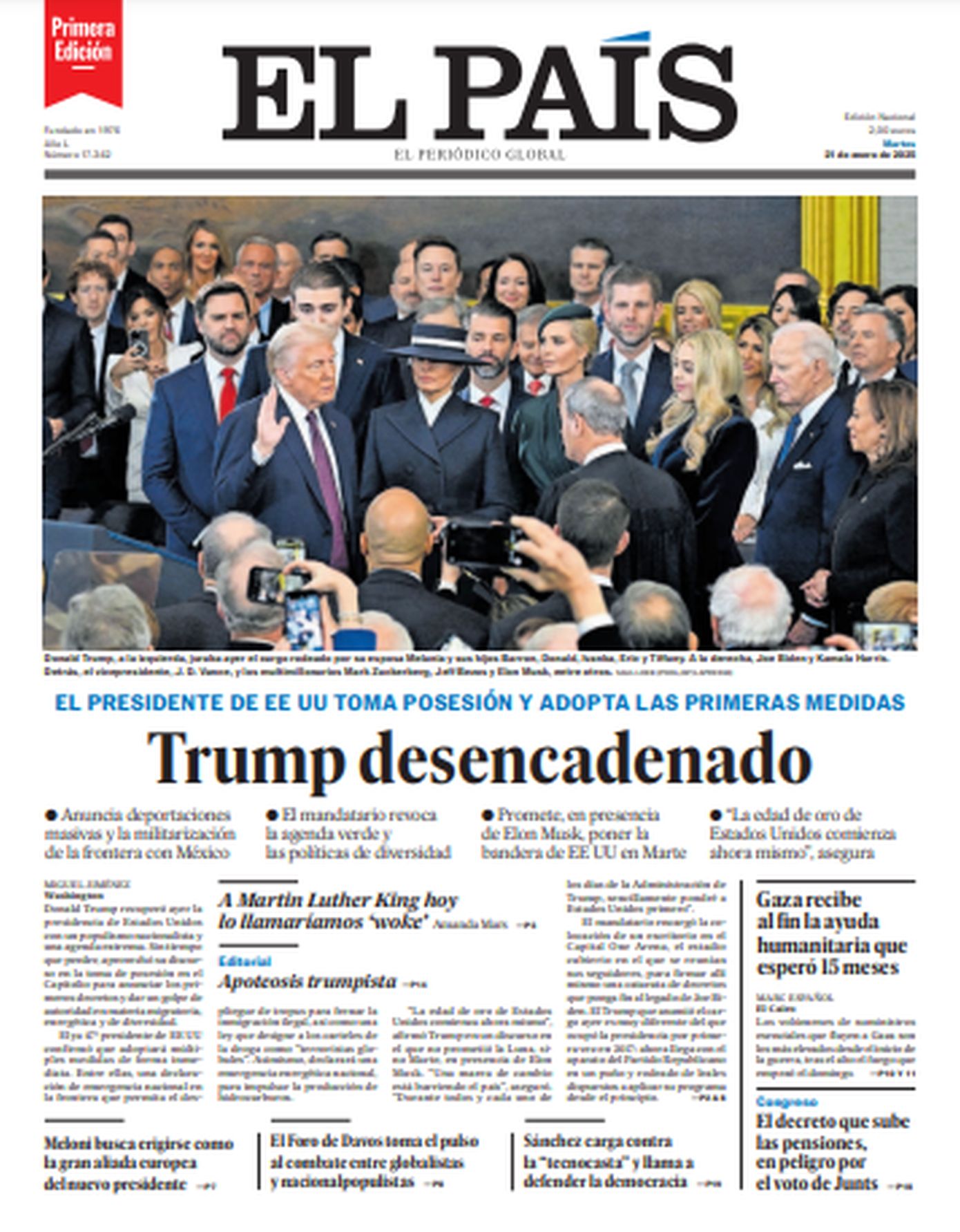 «Ο Ντόναλντ Τραμπ επέστρεψε» είναι ο τίτλος σε αρκετά πρωτοσέλιδα του διεθνούς Τύπου σήμερα, λίγες ώρες μετά την ορκωμοσία του. Είναι η δεύτερη θητεία του στο αξίωμα και η είδηση, όπως ήταν αναμενόμενο, πρωταγωνιστεί στις πρώτες σελίδες.