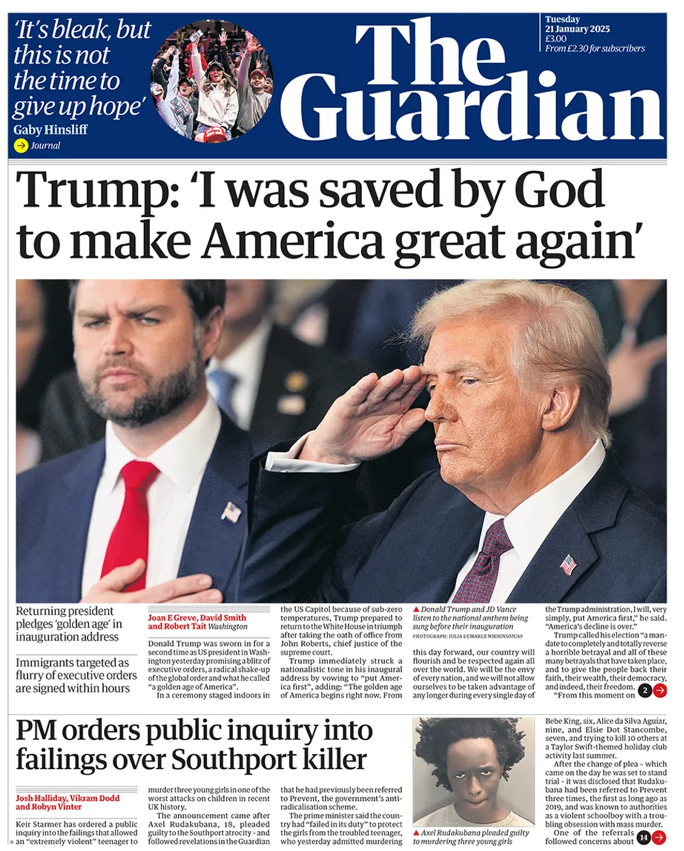 «Επέστρεψε… και κηρύσσει πόλεμο στα πάντα», γράφει η Daily Mirror, ενώ οι Times υπογραμμίζουν αυτό που χαρακτηρίζουν «εκτεταμένη και μαχητική πολιτική ατζέντα» του Τραμπ. Ο Guardian την περιγράφει ως «ριζική αναταραχή της παγκόσμιας τάξης», ενώ η διεθνής έκδοση των New York Times αναφέρει ότι ο Τραμπ σχεδιάζει «επίδειξη δύναμης, από την αρχή».