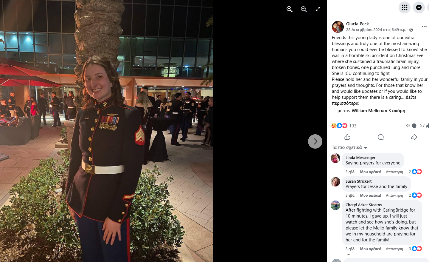 Όπως αναφέρει η «Colorado Sun», το τραγικό δυστύχημα έγινε όταν η νεαρή πεζοναύτης, ονόματι Jessie Mello, έκανε σκι στις 24 Δεκεμβρίου και σε πτώση της στο μεσαίο επίπεδο του θερέτρου τραυματίστηκε σοβαρά στο κεφάλι και έσπασε πολλά οστά στο σώμα της. Όπως αποκάλυψε ο πατέρας της, η Mello έκανε σκι όταν βρέθηκε σε κάποιο εμπόδιο από πάγο, με αποτέλεσμα να φύγει εκτός πορείας και να πέσει πάνω σε ένα δέντρο. Μάλιστα, δεν ήταν αρκετό για να την προστατεύσει από τα βαριά τραύματα ούτε το κράνος που φορούσε.