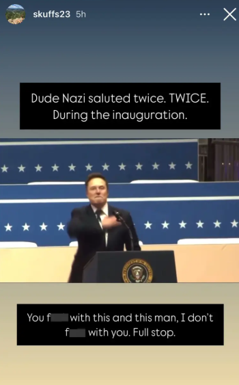 Στο πρώτο story, η Kuffel σχολίασε μια εικόνα του Μασκ στο βάθρο, γράφοντας: «Ο ναζιστής χαιρέτησε δύο φορές κατά τη διάρκεια της ορκωμοσίας. ΔΥΟ ΦΟΡΕΣ».