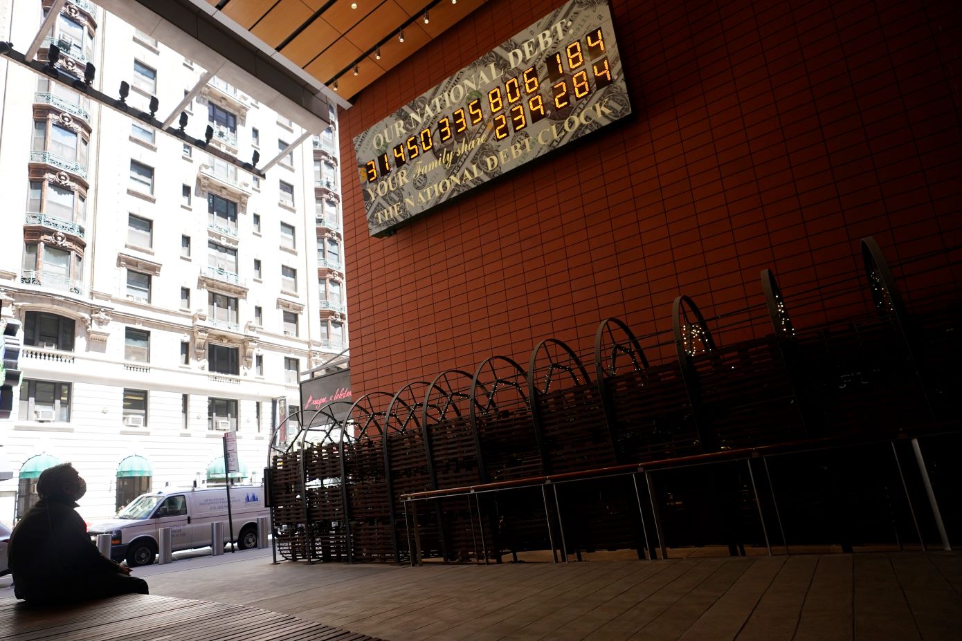 Μία μεγάλη πινακίδα έξω από τον πύργο της Bank of America στη Νέα Υόρκη θυμίζει συνέχεια στους περαστικούς πόσο γρήγορα αυξάνεται το δημόσιο χρέος της χώρας.