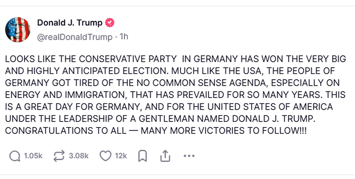 «Είναι μια μεγάλη μέρα για τη Γερμανία και για τις Ηνωμένες Πολιτείες της Αμερικής», χαιρέτισε ο Ρεπουμπλικάνος πρόεδρος στην πλατφόρμα του Truth Social, καθώς οι συντηρητικοί του Χριστιανοδημοκρατικού Κόμματος (CDU) και του συμμάχου τους της Βαυαρίας, της Χριστιανοκοινωνικής Ένωσης (CSU), λαμβάνουν ποσοστό σχεδόν 29%.