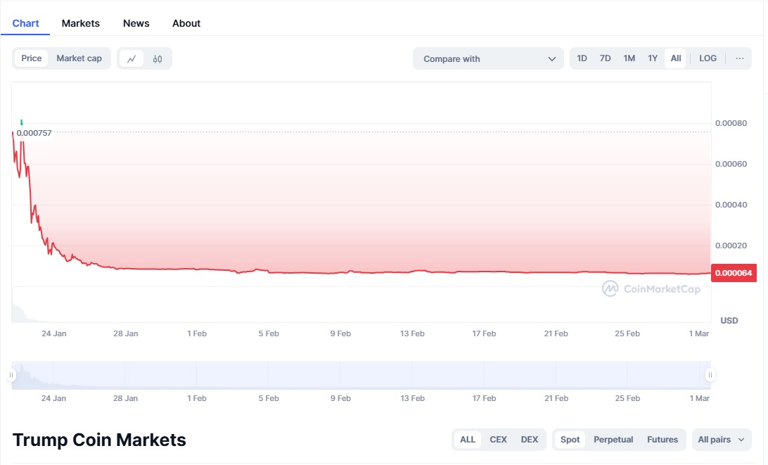Το $Trump, ένα «meme coin» που παρουσιάστηκε στις 17 Ιανουαρίου, τρεις ημέρες πριν από την ορκωμοσία του Τραμπ, έχει χάσει πάνω από το 80% της αξίας του από την ανώτερη τιμή του στις 19 Ιανουαρίου.