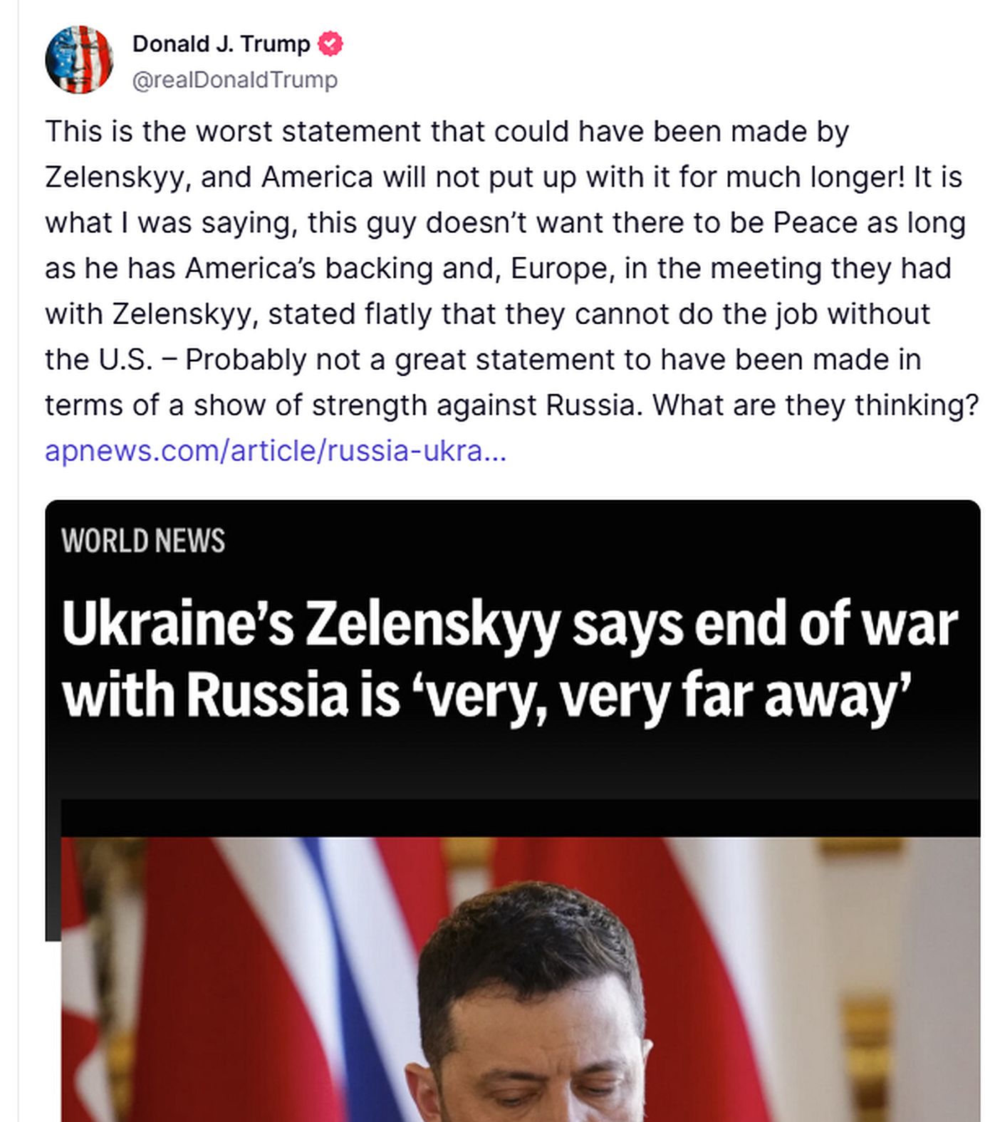 Ο Τραμπ πάντως νωρίτερα επιτέθηκε και πάλι δημοσίως στον Ζελένσκι επειδή είπε ότι ο πόλεμος με τη Ρωσία είναι πιθανό να συνεχιστεί για αρκετό καιρό. «Αυτή είναι η χειρότερη δήλωση που θα μπορούσε να κάνει ο Ζελένσκι και η Αμερική δεν θα το ανεχτεί για πολύ ακόμα!». έγραψε ο Τραμπ στην πλατφόρμα κοινωνικής δικτύωσης Truth Social, χρησιμοποιώντας διαφορετική γραφή του ονόματος του Ουκρανού ηγέτη.