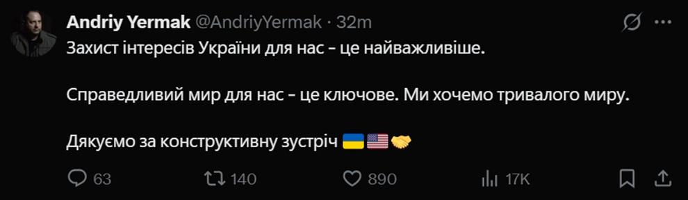 «Η προστασία των συμφερόντων της Ουκρανίας είναι το πιο σημαντικό για εμάς. Η δίκαιη ειρήνη είναι το κλειδί για εμάς. Θέλουμε μια διαρκή ειρήνη. Ευχαριστούμε για την εποικοδομητική συνάντηση», έγραψε ο Γερμάκ στο X.