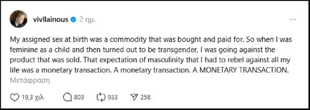 «Το φύλο που μου δόθηκε κατά τη γέννησή μου ήταν ένα εμπόρευμα που αγοράστηκε και πληρώθηκε. Έτσι, όταν ήμουν θηλυκό ως παιδί και στη συνέχεια αποδείχθηκε ότι είμαι τρανς, πήγαινα αντίθετα στο προϊόν που πουλήθηκε. Αυτή η προσδοκία του ανδρισμού, ενάντια στην οποία έπρεπε να επαναστατήσω σε όλη μου τη ζωή, ήταν μια χρηματική συναλλαγή. ΜΙΑ ΝΟΜΙΣΜΑΤΙΚΗ ΣΥΝΑΛΛΑΓΗ. Πώς στο διάολο είναι νόμιμο αυτό;» έγραψε στην ανάρτηση που έκανε.
