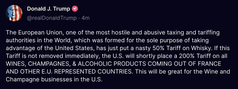 «Η Ευρωπαϊκή Ένωση, μία από τις πιο εχθρικές και καταχρηστικές φορολογικές και δασμολογικές αρχές στον κόσμο, η οποία δημιουργήθηκε με μοναδικό σκοπό να εκμεταλλεύεται τις ΗΠΑ, μόλις επέβαλε έναν άθλιο δασμό 50% στο ουίσκι» έγραψε χαρακτηριστικά.