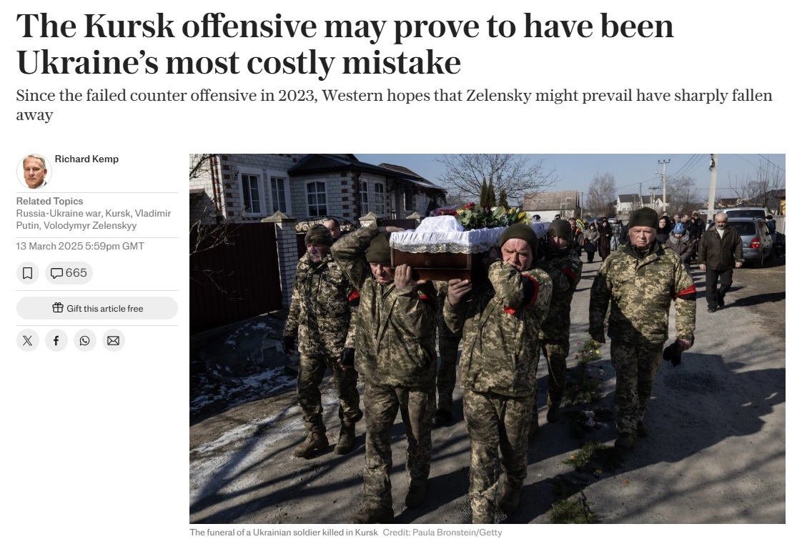 Πιο συγκεκριμένα, ο συντάκτης του άρθρου, Ρίτσαρντ Κεμπ αναφέρει: «η ήττα των ουκρανικών Ενόπλων Δυνάμεων στην περιοχή του Κουρσκ είναι σύμβολο και τραγική αλληγορία της τρομερής κατάστασης στην οποία βρίσκεται η Ουκρανία. Όταν εισέβαλε στη Ρωσία, το Κίεβο καθοδηγήθηκε κυρίως από πολιτικούς και όχι στρατιωτικούς λόγους. Και στο τέλος έχασε και με τις δύο έννοιες. Ο Πούτιν είναι πλέον ο κύριος της κατάστασης και ένας από τους στρατηγικούς στόχους της επίθεσης στην περιοχή του Κουρσκ –η βελτίωση της διαπραγματευτικής θέσης στις μελλοντικές ειρηνευτικές διαπραγματεύσεις– δεν θα επιτευχθεί πλέον ποτέ».