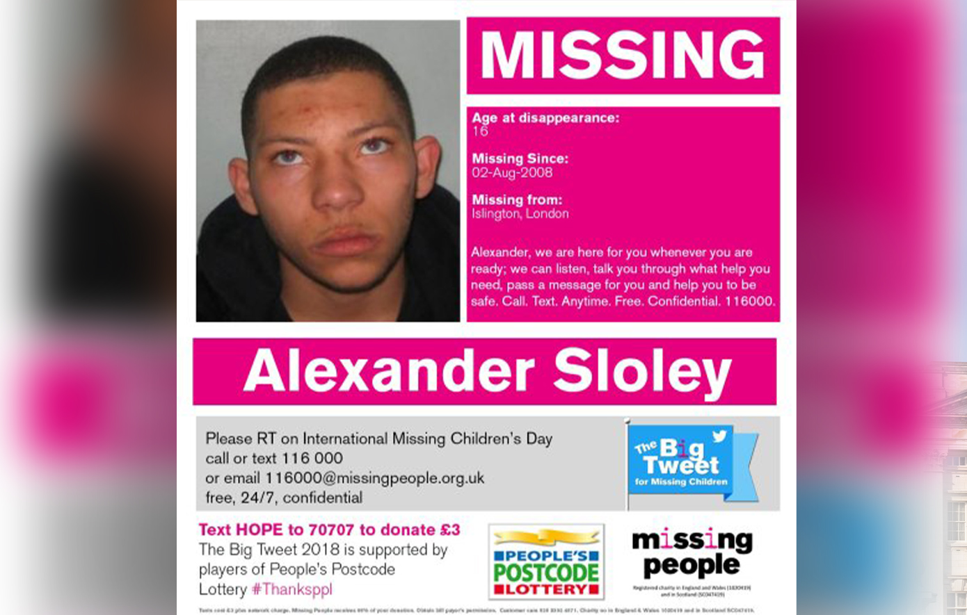 Ο Alexander Sloley, ένας 16χρονος φοιτητής λογιστικής, είχε λίγα χρήματα, καθόλου πορτοφόλι ή διαβατήριο όταν εξαφανίστηκε στο Ίσλινγκτον, βόρεια του Λονδίνου, δύο ημέρες πριν από τα γενέθλιά του τον Αύγουστο του 2008. Είχε επισκεφτεί το σπίτι ενός φίλου του στο Έντμοντον, αλλά αποφάσισε να επιστρέψει σπίτι του κατά το μεσημέρι.