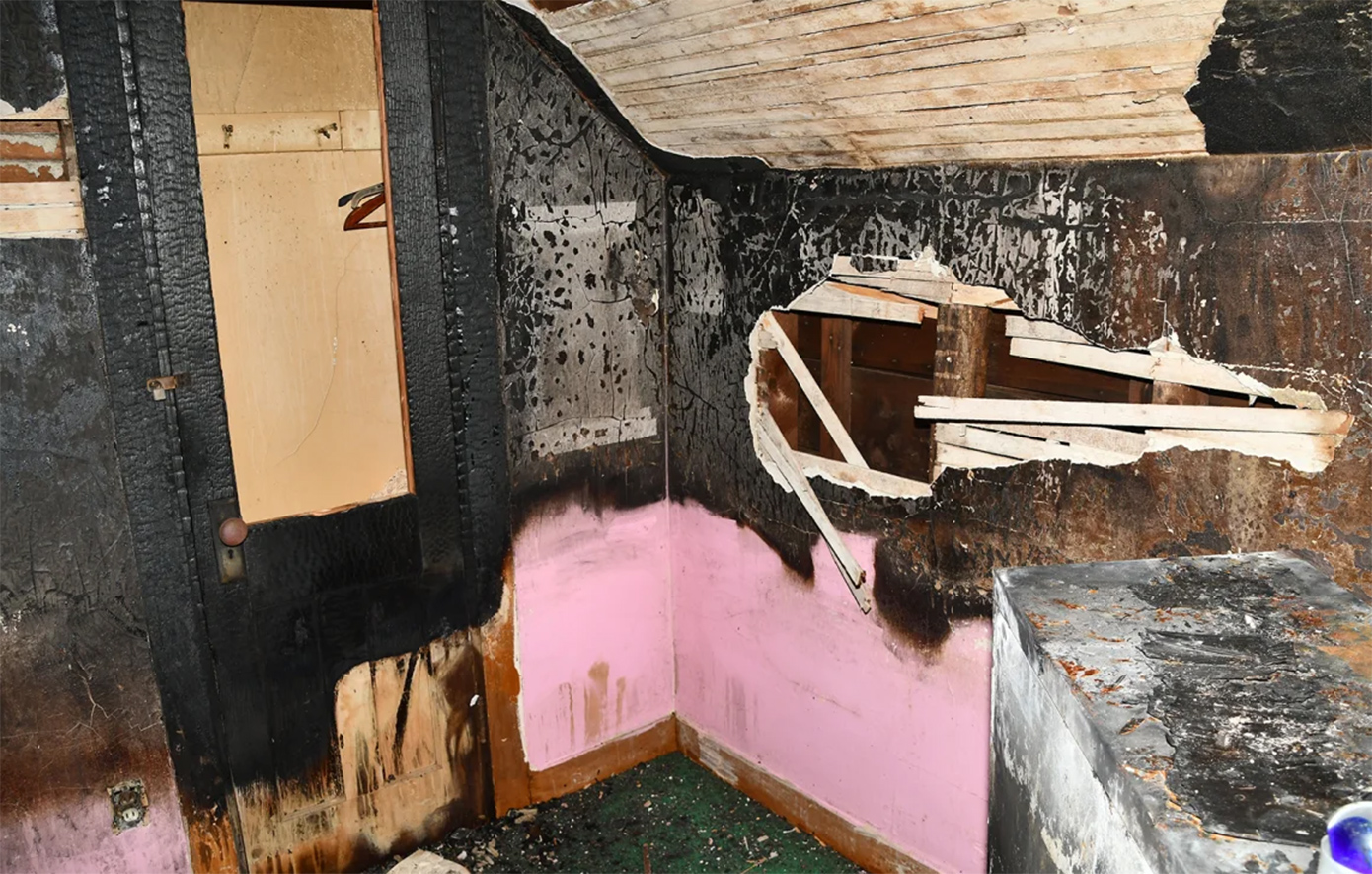 Οι φωτογραφίες οι οποίες δημοσιεύτηκαν τη Δευτέρα από το Αστυνομικό Τμήμα Waterbury δείχνουν αρκετά δωμάτια σε ακαταστασία και τοίχους μαυρισμένους από τη φωτιά. Σοροί ρούχων και σκουπίδια είναι πεταμένα σε όλο το -εγκαταλελειμμένο- σπίτι, ενώ μία στοίβα από καμένα ρούχα βρίσκεται πάνω σε δύο πλαστικά δοχεία αποθήκευσης, τα οποία φαίνεται να έχουν παραμορφωθεί και λιώσει από την έντονη θερμότητα.