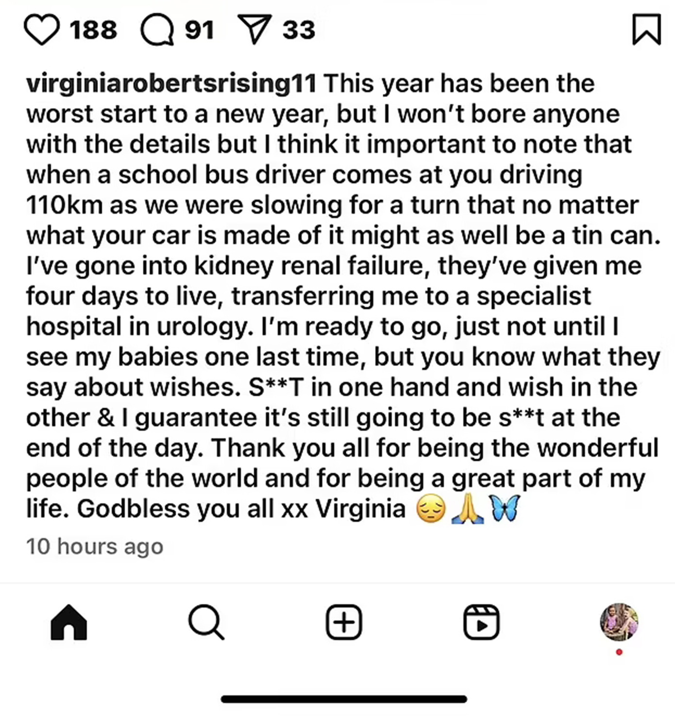 Η λεζάντα στην «κατά λάθος» ανάρτησή της ανέφερε: «Αυτή η χρονιά έχει ξεκινήσει με τον χειρότερο τρόπο, αλλά δεν θα σας κουράσω με λεπτομέρειες. Είναι σημαντικό όμως να αναφέρω πως, όταν ένας οδηγός σχολικού λεωφορείου έρχεται κατά πάνω σου με 110 χιλιόμετρα την ώρα, ενώ επιβραδύνεις για μια στροφή, τότε ό,τι κι αν είναι το αυτοκίνητό σου, είναι σαν κονσέρβα. Έχω υποστεί νεφρική ανεπάρκεια, μου έχουν δώσει τέσσερις μέρες ζωής και με μεταφέρουν σε εξειδικευμένο νοσοκομείο στην ουρολογία. Είμαι έτοιμη να φύγω, αλλά θέλω να δω τα μωρά μου μία τελευταία φορά. Όμως ξέρετε τι λένε για τις ευχές… Καλύτερα να μην πω. Σας ευχαριστώ όλους που ήσασταν υπέροχοι άνθρωποι και κομμάτι της ζωής μου. Ο Θεός να σας ευλογεί όλους. Βιρτζίνια».