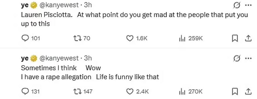 Ο Γουέστ φαίνεται πως σχολίασε ειρωνικά τη μήνυση που κατέθεσε εναντίον του η πρώην μάνατζέρ του, Λόρεν Πισκιότα, η οποία τον κατηγορεί για βιασμό, σεξουαλική παρενόχληση και παρακολούθηση την περίοδο 2021-2022. Ο ίδιος άφησε να εννοηθεί ότι η απόφασή της να κινηθεί νομικά ήταν υποκινούμενη από τρίτους.