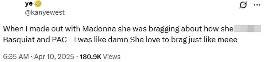 Η Μαντόνα βρέθηκε επίσης στο στόχαστρο του Γουέστ: «Όταν φιλήθηκα με τη Μαντόνα, μου έλεγε καυχιόταν ότι πηδ… με τον Μπασκιάτ και τον PAC. Είπα, ουάου, της αρέσει να καυχιέται όπως και σε μένα».