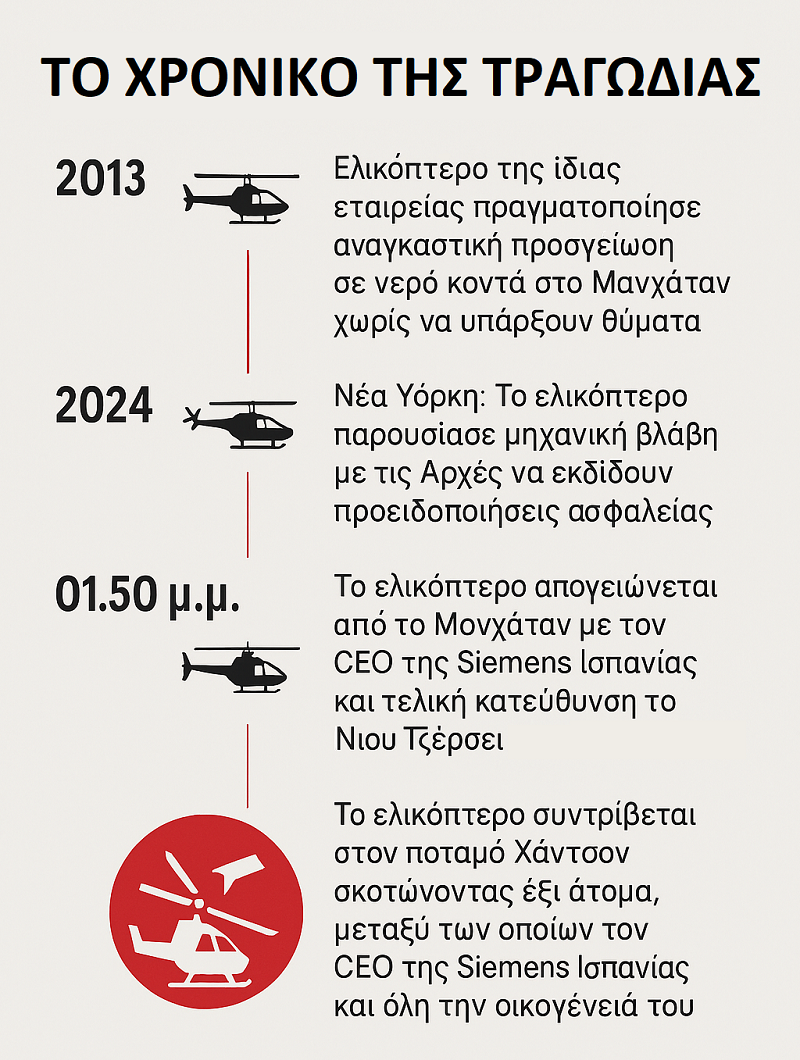 Η ιδιοκτήτρια εταιρεία του ελικοπτέρου Bell206L-4 LongRanger IV το οποίο κατέπεσε στον ποταμό Χάντσον προκαλώντας τον θάνατο του CEO της Siemens Ισπανίας, Αγκουστίν Εσκομπάρ, της οικογένειάς του και του πιλότου, είχε εμπλακεί στο παρελθόν σε υποθέσεις με προβλήματα ασφάλειας.