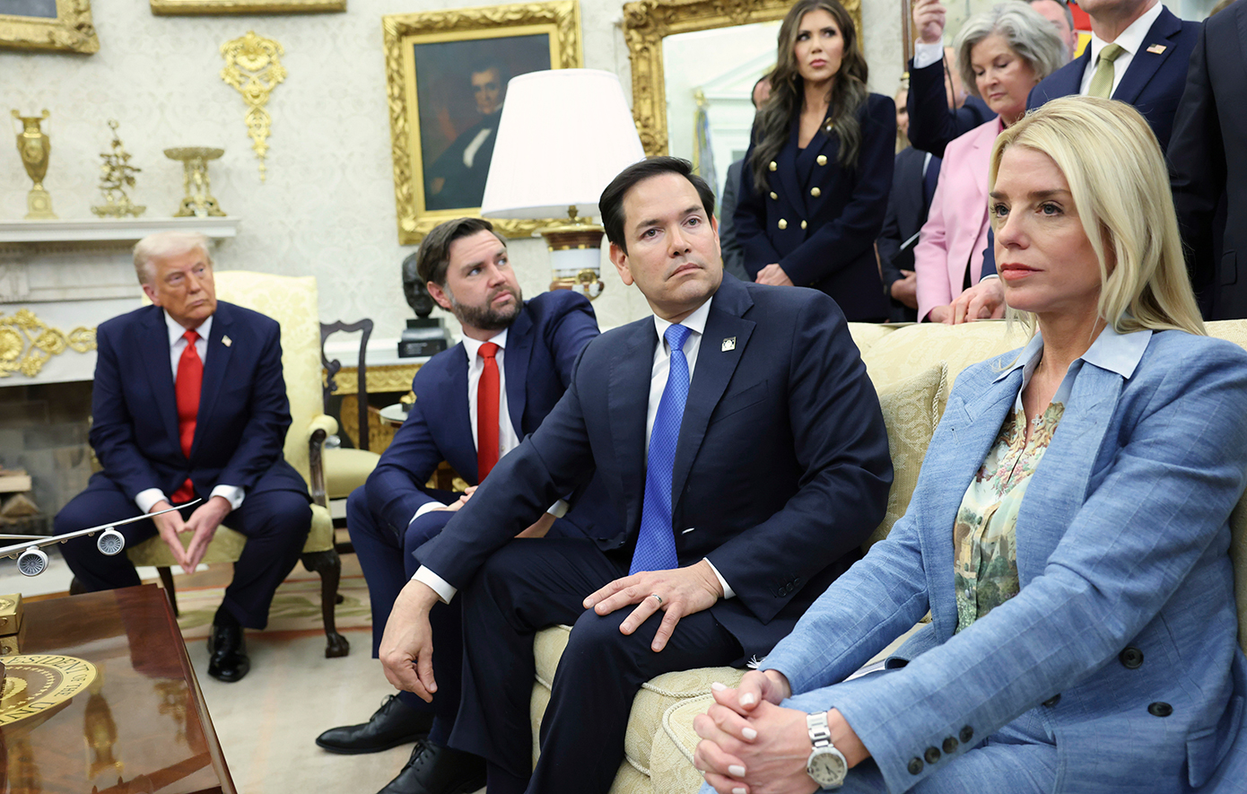 Κατά τη διάρκεια της συνάντησης στο Οβάλ Γραφείο, ο Τραμπ απευθύνθηκε σε μέλη της κυβέρνησής του -συμπεριλαμβανομένης της Γενικής Εισαγγελέως Παμ Μπόντι, του αναπληρωτή προσωπάρχη Στίβεν Μίλερ και του υπουργού Εξωτερικών, Μάρκο Ρούμπιο- για να υπογραμμίσει το επιχείρημα της κυβέρνησης ότι οι ΗΠΑ δεν έχουν την εξουσία να επιστρέψουν τον Αμπρέγκο Γκαρσία.
