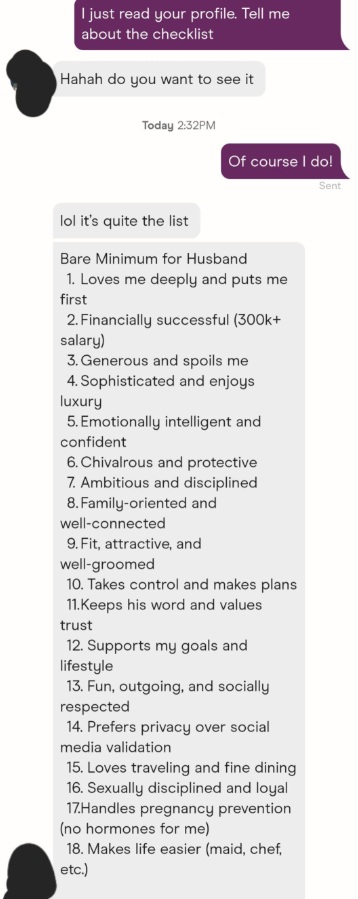 Όπως αναφέρει η nypost ο άνδρας, σοκαρισμένος από τις απαιτήσεις της, μοιράστηκε μια φωτογραφία της συνομιλίας τους στο Reddit, ρωτώντας τη γυναίκα: «Διάβασα το προφίλ σου. Πες μου για τη λίστα».