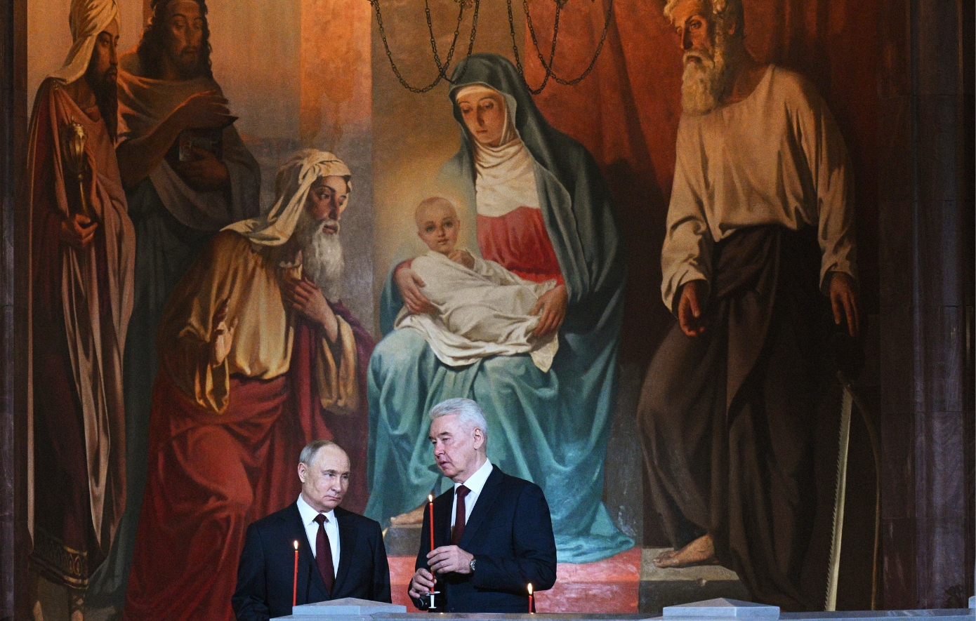 Μερικές ώρες αφού κήρυξε μονομερή κατάπαυση του πυρός για το Πάσχα, για την οποία το Κίεβο είπε πως είναι μόνο λόγια καθώς οι μάχες συνεχίζονται, ο Πούτιν και ο Σομπιάνιν μετέβησαν στην κύρια εκκλησία της Μόσχας, τον Καθεδρικό Ναό του Σωτήρα Χριστού, όπου ο Κύριλλος χοροστατούσε στη λειτουργία.