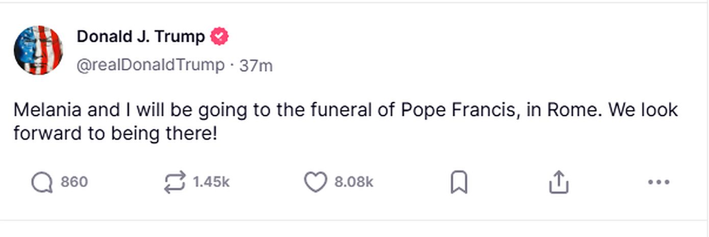 «Η Μελάνια και εγώ θα πάμε στην κηδεία του πάπα Φραγκίσκου, στη Ρώμη» ανέφερε σε ανάρτησή του στην πλατφόρμα Truth Social.