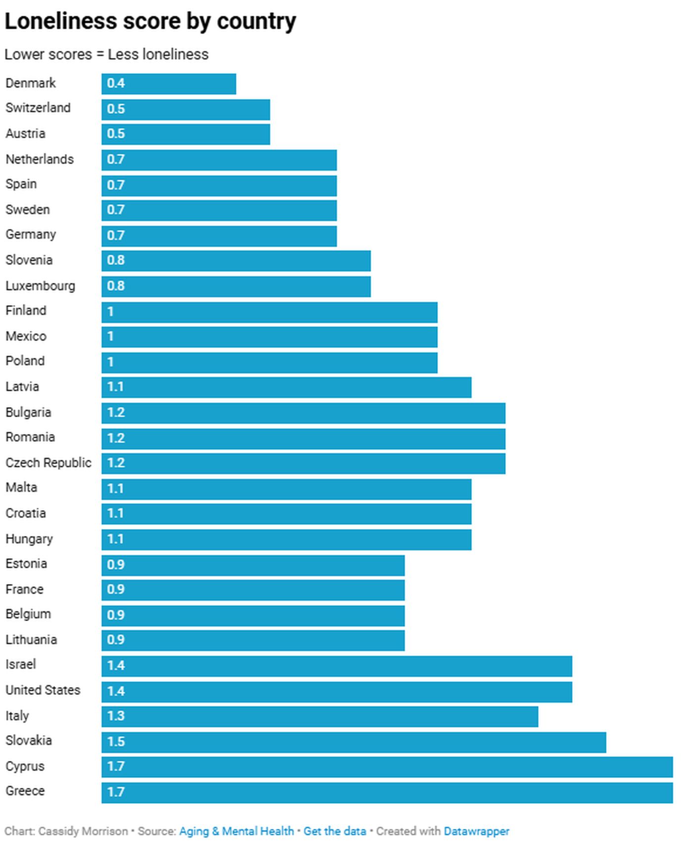 Οι ενήλικες στη Δανία ανέφεραν τα χαμηλότερα επίπεδα μοναξιάς, ενώ οι άνθρωποι στην Ελλάδα και την Κύπρο ανέφεραν τα υψηλότερα συνολικά.