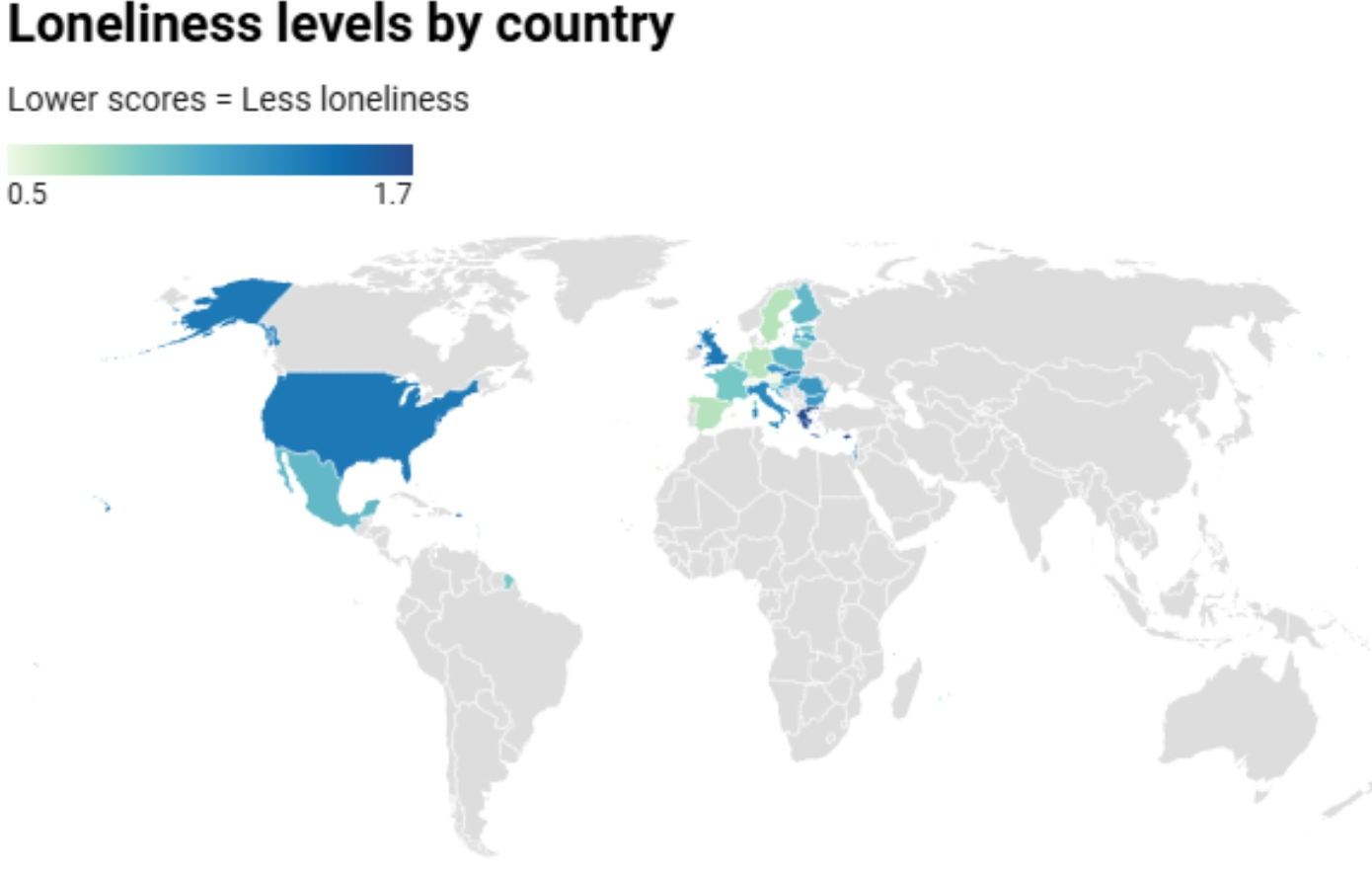 Οι χώρες της νότιας και ανατολικής Ευρώπης παρουσιάζουν τα υψηλότερα επίπεδα μοναξιάς, ιδιαίτερα η Ελλάδα και η Κύπρος (και οι δύο με σκορ 1,7), ακολουθούμενες από τη Σλοβακία (1,5) και την Ιταλία (1,3).