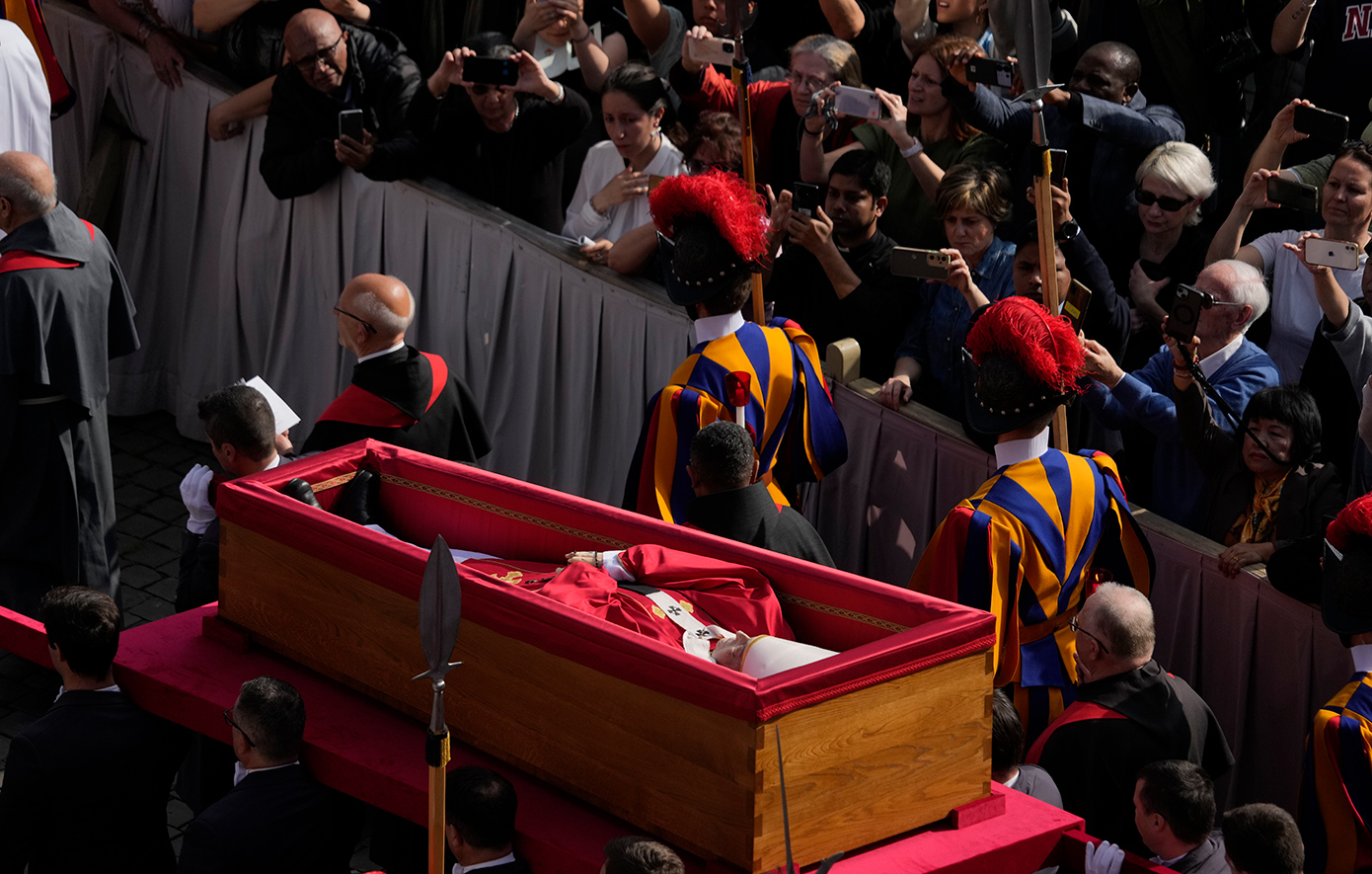 Το Βατικανό έδωσε στη δημοσιότητα φωτογραφίες της σορού του πάπα που βρίσκεται στο παρεκκλήσι της Casa Santa Marta – την κατοικία του κατά τη διάρκεια της 12ετούς παποσύνης του – ντυμένος με κόκκινο χιτώνα, με την παπική μίτρα στο κεφάλι και ένα κομποσκοίνι στο χέρι.