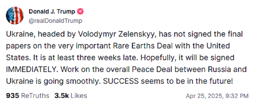 «Η Ουκρανία, που διοικείται από τον Βολοντίμιρ Ζελένσκι, δεν έχει υπογράψει τα τελικά χαρτιά για την πολύ σημαντική Συμφωνία των Σπάνιων Γαιών με τις Ηνωμένες Πολιτείες. Έχει καθυστερήσει τουλάχιστον τρεις εβδομάδες. Ας ελπίσουμε ότι θα υπογραφεί ΑΜΕΣΩΣ. Οι εργασίες για τη συνολική Συμφωνία Ειρήνης μεταξύ Ρωσίας και Ουκρανίας εξελίσσονται ομαλά».