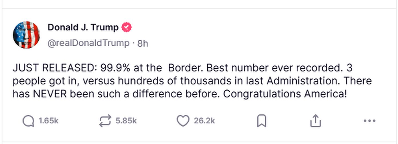 «Μόλις ανακοινώθηκε: 99,9% στα σύνορα. Το καλύτερο ποσοστό που έχει καταγραφεί ποτέ. Μόνο 3 άτομα μπήκαν, έναντι εκατοντάδων χιλιάδων κατά την προηγούμενη κυβέρνηση. Ποτέ δεν έχει υπάρξει τέτοια διαφορά στο παρελθόν. Συγχαρητήρια Αμερική!», έγραψε ο Ντόναλντ Τραμπ, παραθέτοντας, ωστόσο στοιχεία των οποίων η εγκυρότητα παραμένει απροσδιόριστη.