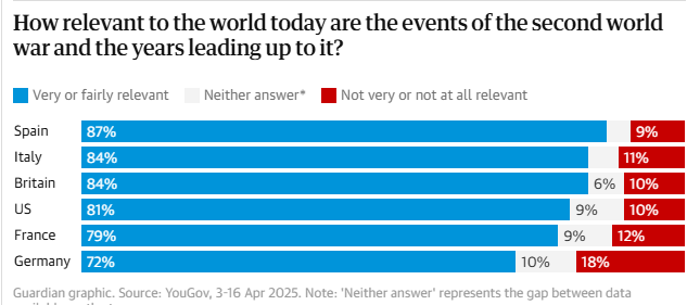Σε ό,τι αφορά τη μνήμη του Β’ Παγκοσμίου Πολέμου, οι περισσότεροι Ευρωπαίοι συμφωνούν ότι παραμένει επίκαιρη και ότι πρέπει να διδάσκεται. Η πλειοψηφία (82% έως 90%) υποστηρίζει τη συνέχιση της διδασκαλίας του πολέμου στα σχολεία, ενώ 72% έως 87% θεωρούν ότι τα μαθήματα της περιόδου παραμένουν σχετικά με το σήμερα.