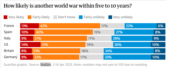 Η έρευνα της YouGov την οποία δημοσιεύει ο Guardian, αποκάλυψε ότι μεταξύ 41% και 55% των ερωτηθέντων σε Βρετανία, Γαλλία, Γερμανία, Ιταλία και Ισπανία θεωρούν «πολύ» ή «αρκετά πιθανό» να ξεσπάσει τρίτος Παγκόσμιος Πόλεμος μέσα στη δεκαετία — θέση που συμμερίζεται και το 45% των Αμερικανών.