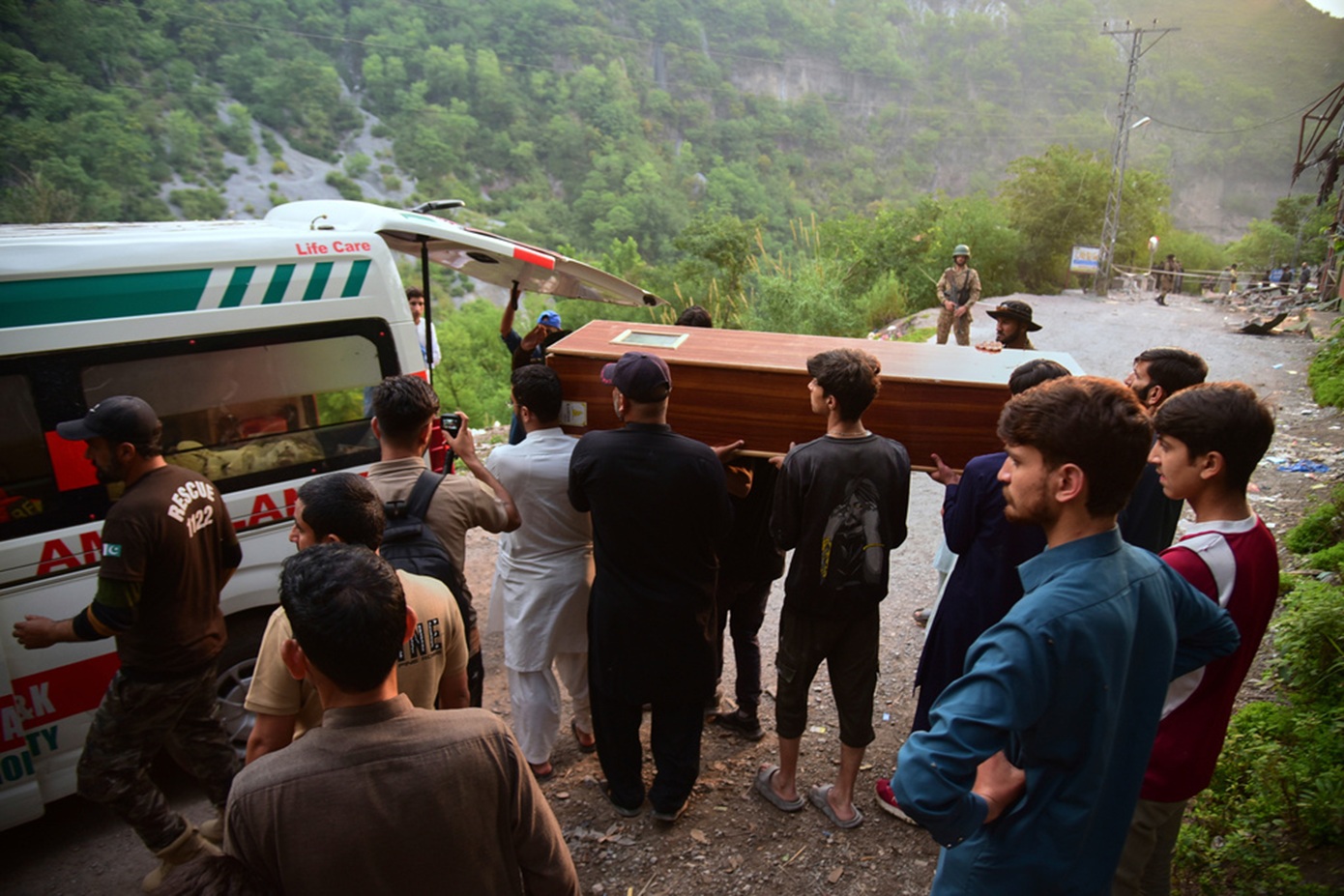 Άρχισαν κηδείες θυμάτων. Στη Μουζαφαραμπάντ, δεκάδες πακιστανοί, με σκυμμένα κεφάλια γύρω από ξύλινο φέρετρο, απέτισαν τον ύστατο χαιρετισμό σε θύμα.