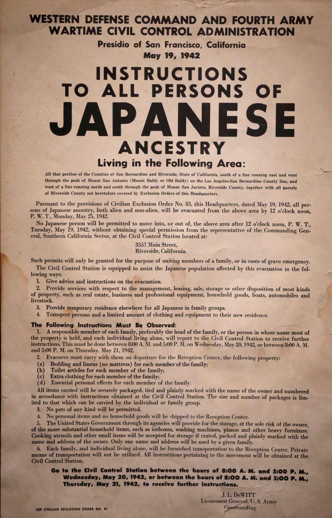 Στις 19 Φεβρουαρίου 1942, ο τότε πρόεδρος Φράνκλιν Ντ. Ρούσβελτ υπέγραψε την Εκτελεστική Εντολή 9066, η οποία εξουσιοδοτούσε το Υπουργείο Πολέμου να δημιουργήσει «στρατιωτικές ζώνες» και να απομακρύνει από αυτές άτομα που θεωρούνταν απειλή για την εθνική ασφάλεια.