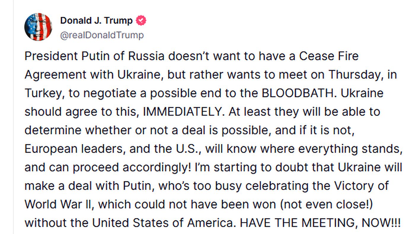Ο Αμερικανός πρόεδρος Ντόναλντ Τραμπ, νωρίτερα με ανάρτησή του κάλεσε την Ουκρανία να συμφωνήσει σε άμεσες συνομιλίες με τη Ρωσία, υποστηρίζοντας ότι ο Ρώσος πρόεδρος Βλαντίμιρ Πούτιν επιθυμεί να συναντηθεί την Πέμπτη στην Τουρκία για να συζητήσει μια πιθανή διευθέτηση της σύγκρουσης.