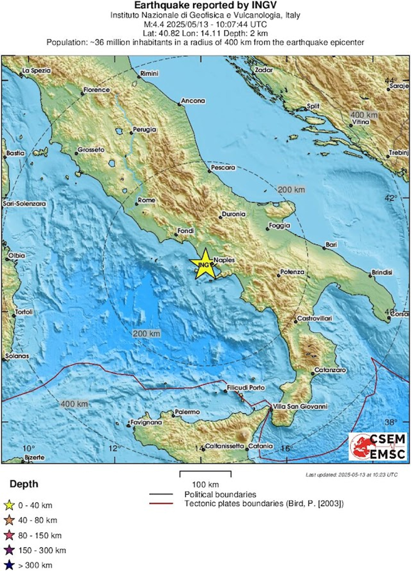 Σεισμική δόνηση 4,4 βαθμών καταγράφηκε στις 12:07 (τοπική ώρα), στην περιοχή Κάμπι Φλέγκρεϊ, λίγο έξω από τη Νάπολη, στην Ιταλία.