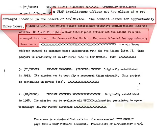 Ανακαλύφθηκαν έγγραφα που υποστηρίζουν ότι η αμερικανική κυβέρνηση είχε επαφή με εξωγήινους πριν από 60 χρόνια. Περισσότερες από 50 σελίδες αρχείων της CIA, τις οποίες το FBI χαρακτηρίζει ως πλαστές, αναφέρουν ότι το 1959 ξεκίνησε μυστικό πρόγραμμα επικοινωνίας με UFO μέσω δυαδικής γλώσσας. Πέντε χρόνια αργότερα, το 1964, αξιωματούχος της Πολεμικής Αεροπορίας φέρεται να συναντήθηκε με δύο εξωγήινους στη Νέα Μέξικο.