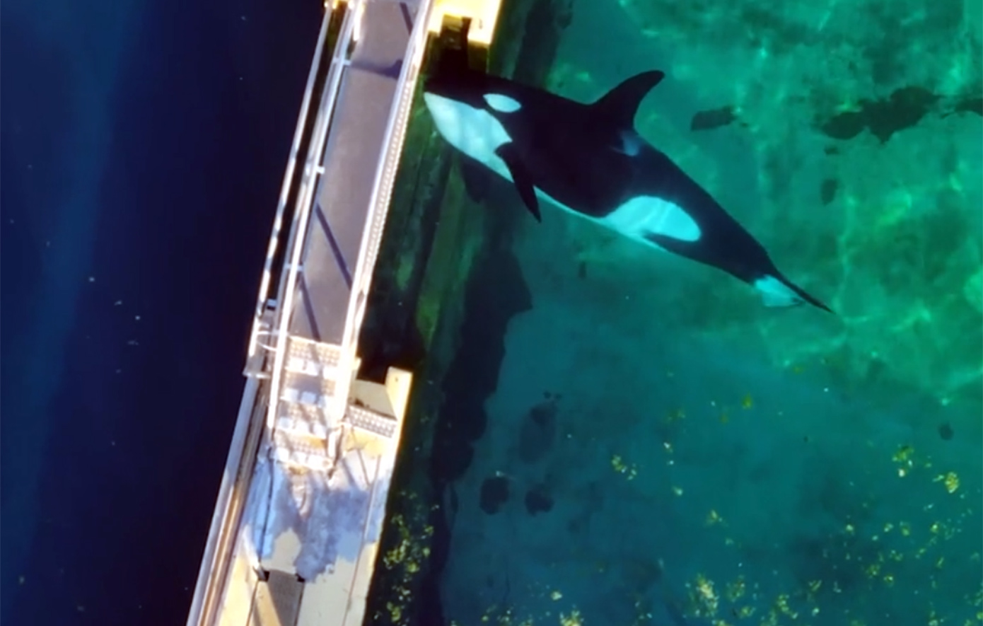 Σοκαριστικά πλάνα από drone που δόθηκαν στη δημοσιότητα από την ομάδα ακτιβιστών για τα ζώα TideBreakers δείχνουν τις όρκες Wikie, 23 ετών, και τον 11χρονο γιο της Keijo να περιφέρονται άσκοπα μέσα στο εγκαταλελειμμένο πάρκο.
