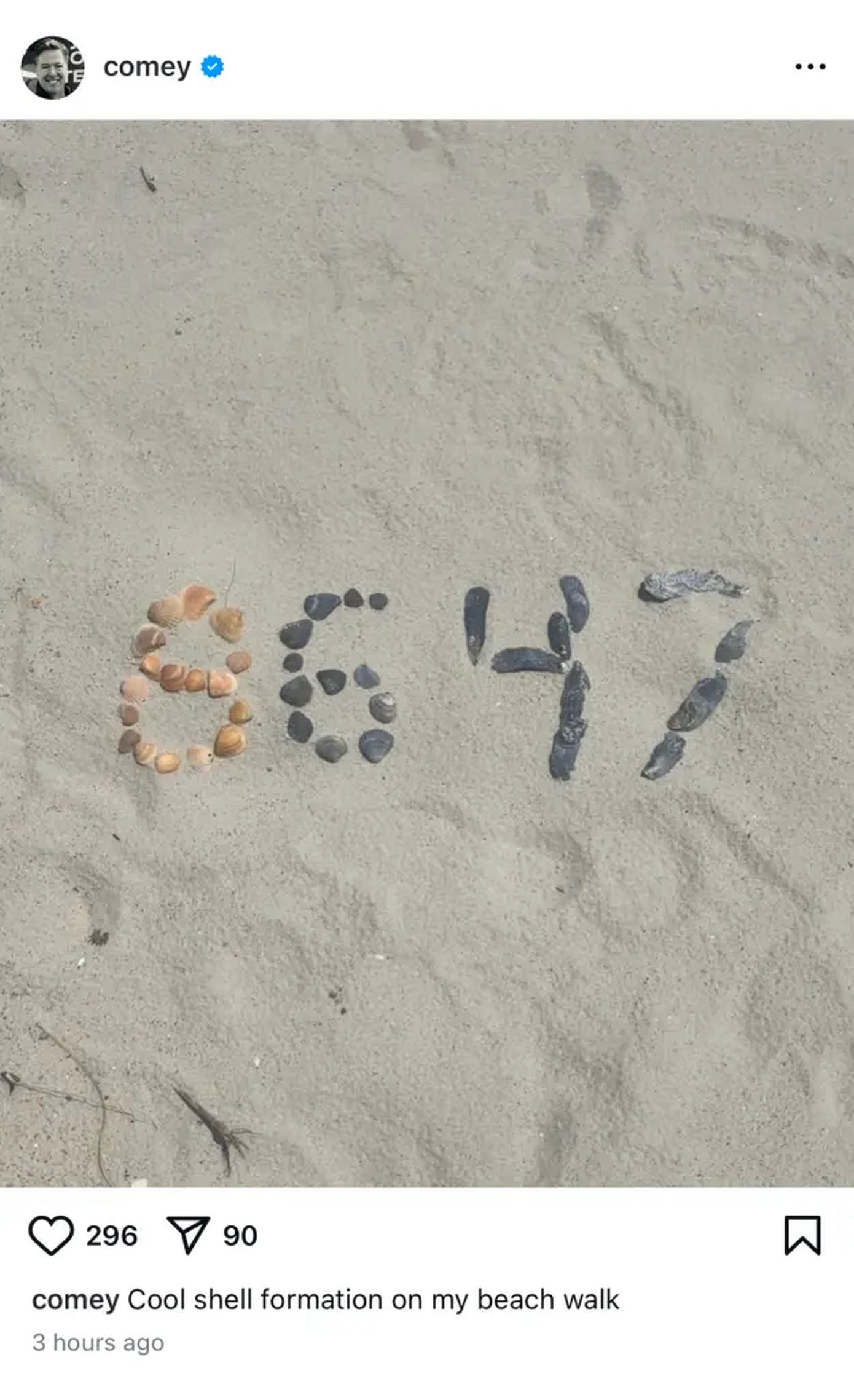 Σε ανάρτησή του στο Instagram που πλέον έχει διαγραφεί, ο Τζέιμς Κόμι μοιράστηκε φωτογραφία στην οποία εικονίζονται κοχύλια που σχηματίζουν το μήνυμα «86 47» στην άμμο.