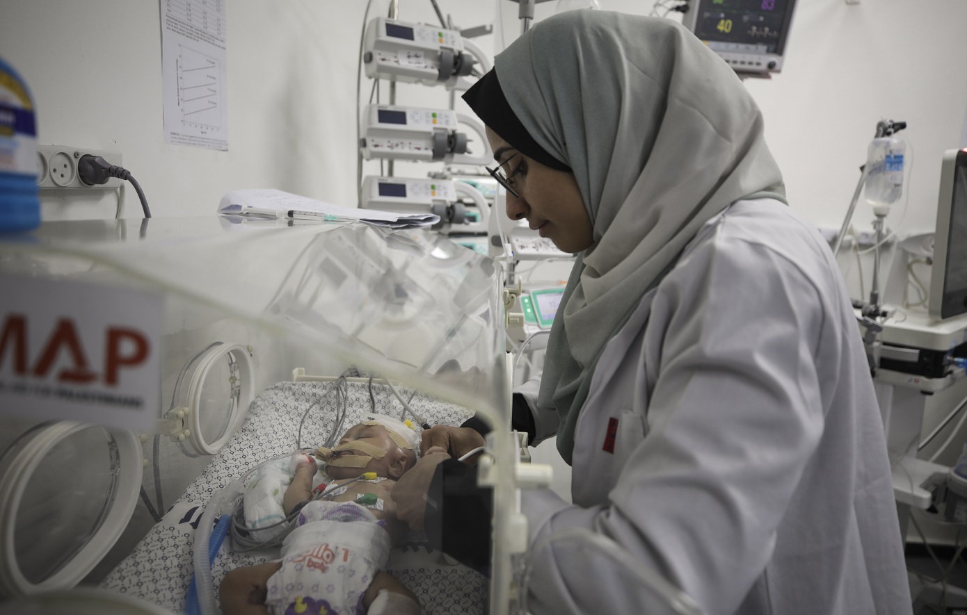 Ένας ανεμιστήρας τους χτυπά μόνιμα για να «σπάσει» κάπως την πρωινή ζέστη. Η Ένας, ανησυχεί ότι η υγεία της μικρής Νιβίν, μπορεί σε οποιαδήποτε στιγμή να χειροτερεύσει. Όπως εξηγεί η μητέρα της, είναι μόλις επτά μηνών και γεννήθηκε κατά τη διάρκεια του πολέμου με μια τρύπα στην καρδιά. Η ίδια εξηγεί πως έδωσε μια πραγματική μάχη για να κρατήσει ζωντανή την κόρη της παρά την κατάρρευση του συστήματος υγείας στη Γάζα.