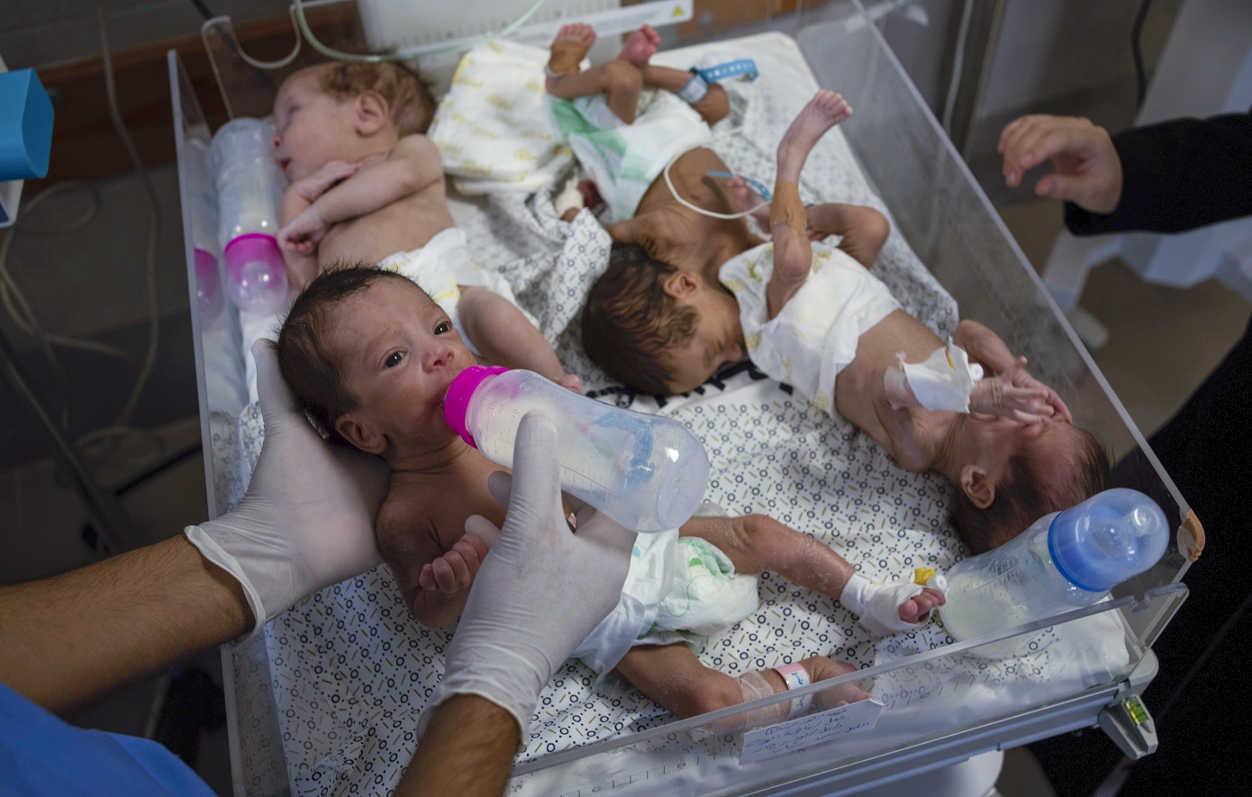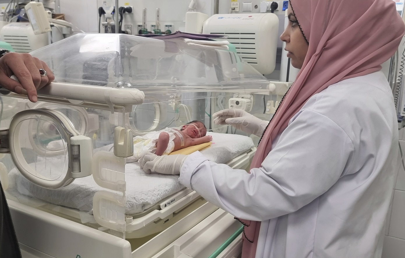 Σε μια αυτοσχέδια σκηνή στον προσφυγικό καταυλισμό αλ – Σάτι, στα βόρεια της Λωρίδας της Γάζας, η 33χρονη Ενάς Αμπού Ντάγκα κρατά στα χέρια της το μικροσκοπικό της βρέφος, τη Νιβίν.