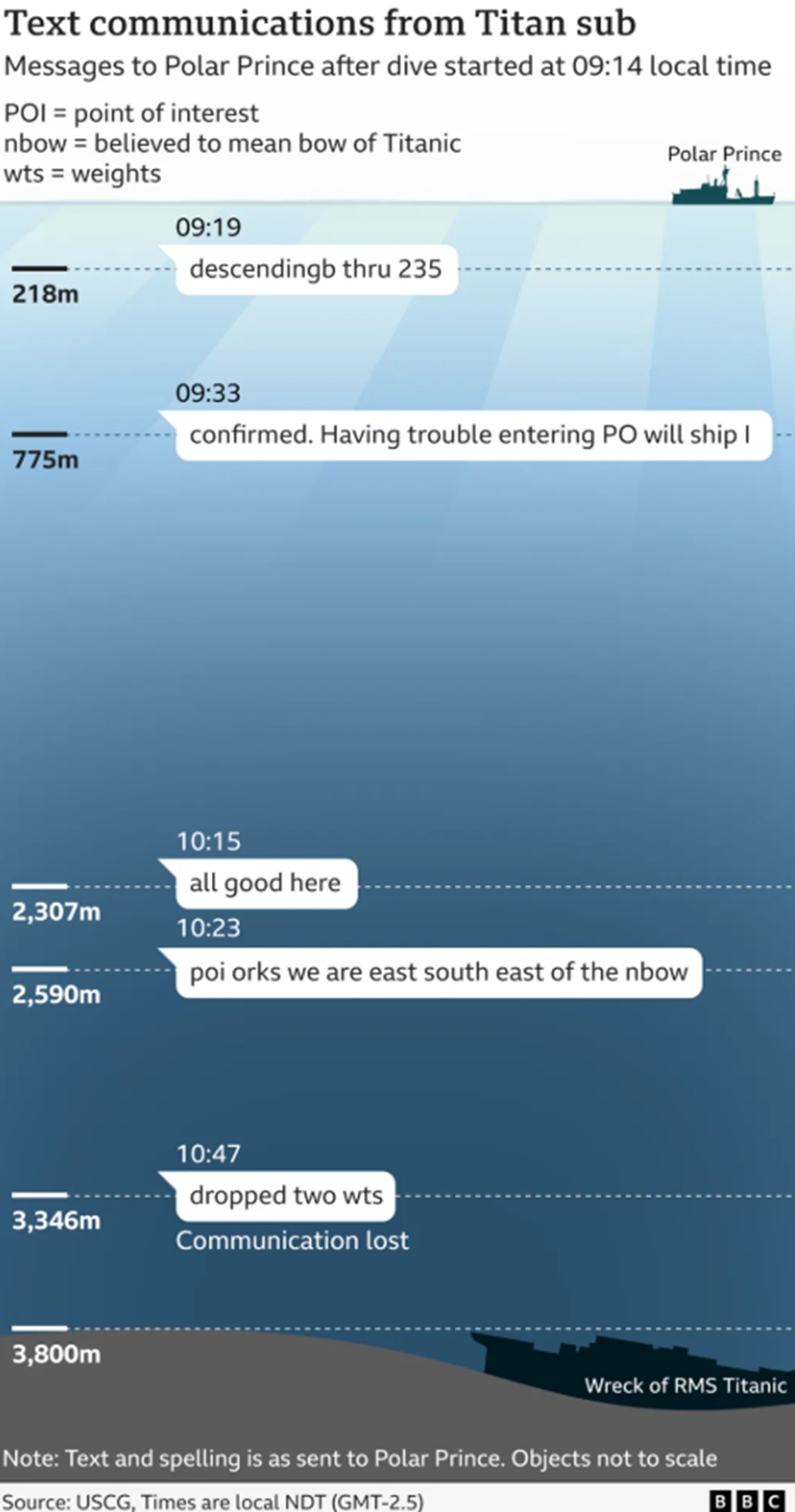Η USCG εκτιμά πως ο ήχος ήταν η έκρηξη του Titan. Το μήνυμα φαίνεται να εστάλη πριν από την καταστροφή αλλά καθυστέρησε να φτάσει στο πλοίο σε σχέση με τον ήχο.