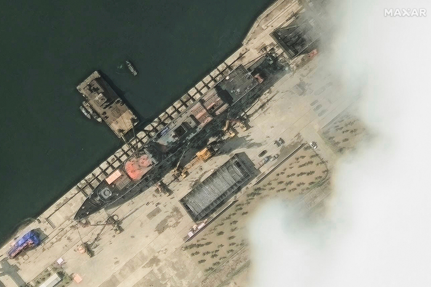 Στις δορυφορικές φωτογραφίες διακρίνεται το πλοίο πλαγιασμένο στο νερό, καλυμμένο με μεγάλους μπλε μουσαμάδες, ενώ ένα τμήμα του βρίσκεται στο έδαφος.