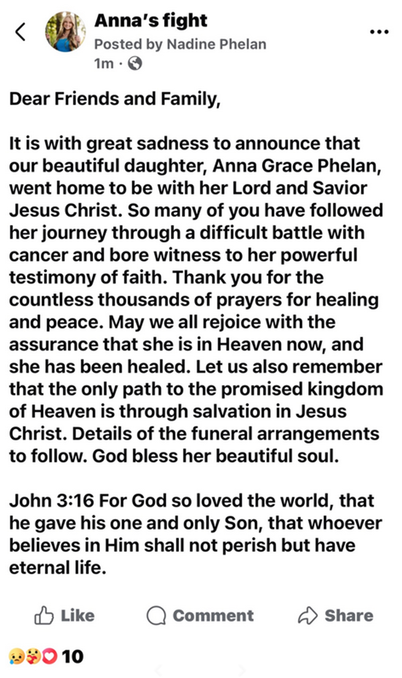 «Με μεγάλη θλίψη ανακοινώνουμε ότι η πανέμορφη κόρη μας, Άννα Γκρέις Φέλαν, πήγε στο σπίτι της για να είναι με τον Κύριο και Σωτήρα της Ιησού Χριστό».