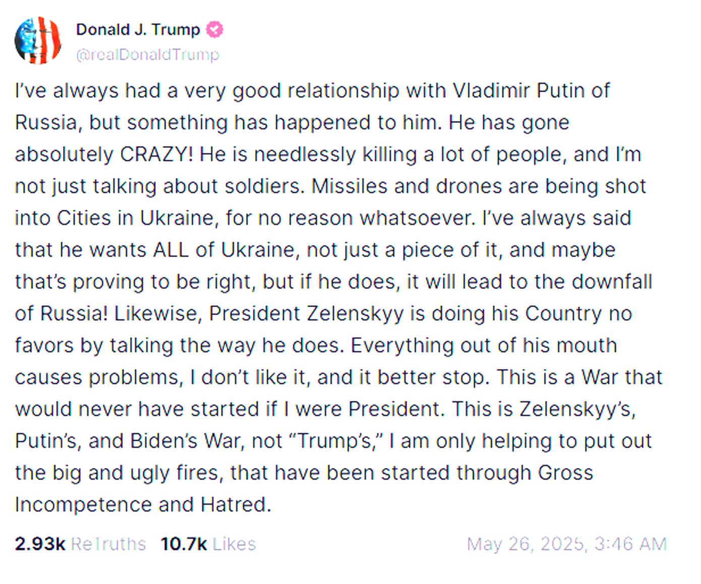 «Έχει τρελαθεί τελείως!», δήλωσε για τον πρόεδρο της Ρωσίας, Βλαντίμιρ Πούτιν, ο Ντόναλντ Τραμπ, σκληραίνοντας αρκετά τον τόνο του. Το Κρεμλίνο απάντησε σήμερα ότι η δήλωση του Αμερικανού προέδρου ίσως να οφείλεται σε υπερβολική συναισθηματική φόρτιση, αλλά ευχαρίστησε τον Αμερικανό ηγέτη για τη βοήθειά του στην έναρξη των ειρηνευτικών διαπραγματεύσεων στην Ουκρανία.