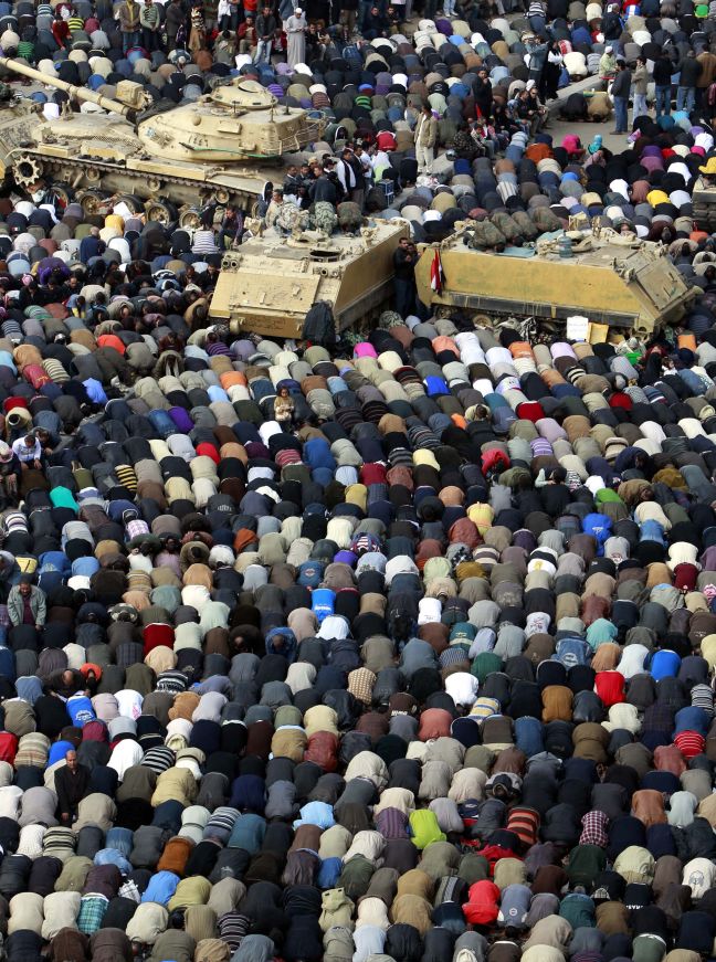 Αντικυβερνητικοί διαδηλωτές και Αιγύπτιοι στρατιώτες πάνω στο όχημά τους, κάνουν τις παραδοσιακές μουσουλμανικές προσευχές της Παρασκευής κατά την συνεχιζόμενη διαδήλωση στην Πλατεία Ταχρίρ στο κεντρικό Κάιρο.