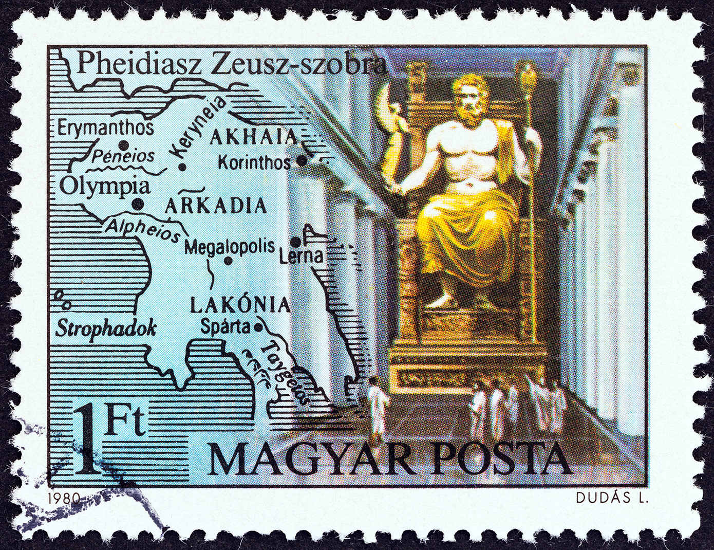 Το εντυπωσιακό άγαλμα που ήταν ένα από τα δύο αριστουργήματα του Έλληνα γλύπτη Φειδία (το άλλο ήταν το άγαλμα της Αθηνάς στον Παρθενώνα), τοποθετήθηκε στον τεράστιο Ναό του Δία στην Ολυμπία. Το ύψος αυτού του θαύματος της αρχαιότητας έφτανε σχεδόν τα 12 μέτρα και ήταν επενδυμένο με χρυσό και ελεφαντόδοντο. Απεικόνιζε τον θεό καθισμένο σε έναν περίτεχνο θρόνο από ξύλο κέδρου, διακοσμημένο με έβενο, ελεφαντόδοντο, χρυσό και πολύτιμους λίθους. Στο εκτεταμένο δεξί του χέρι βρισκόταν ένα άγαλμα της Νίκης, και στο αριστερό του κρατούσε σκήπτρο πάνω στο οποίο ήταν καθισμένος ένας αετός.