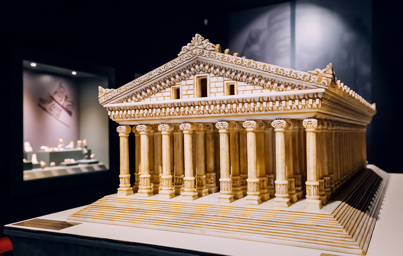 Ο μεγάλος ναός της Αρτέμιδος χτίστηκε από τον Κροίσο, βασιλιά της Λυδίας, περίπου το 550 π.Χ. στην Έφεσο και ξαναχτίστηκε αφού πυρπολήθηκε από έναν παράφρονα ονόματι Ηρόστρατο το 356 π.Χ. Το Αρτεμίσιο ήταν διάσημο όχι μόνο για το τεράστιο μέγεθός του -περίπου 110 επί 55 μέτρα- αλλά και για τα υπέροχα έργα τέχνης που το διακοσμούσαν.